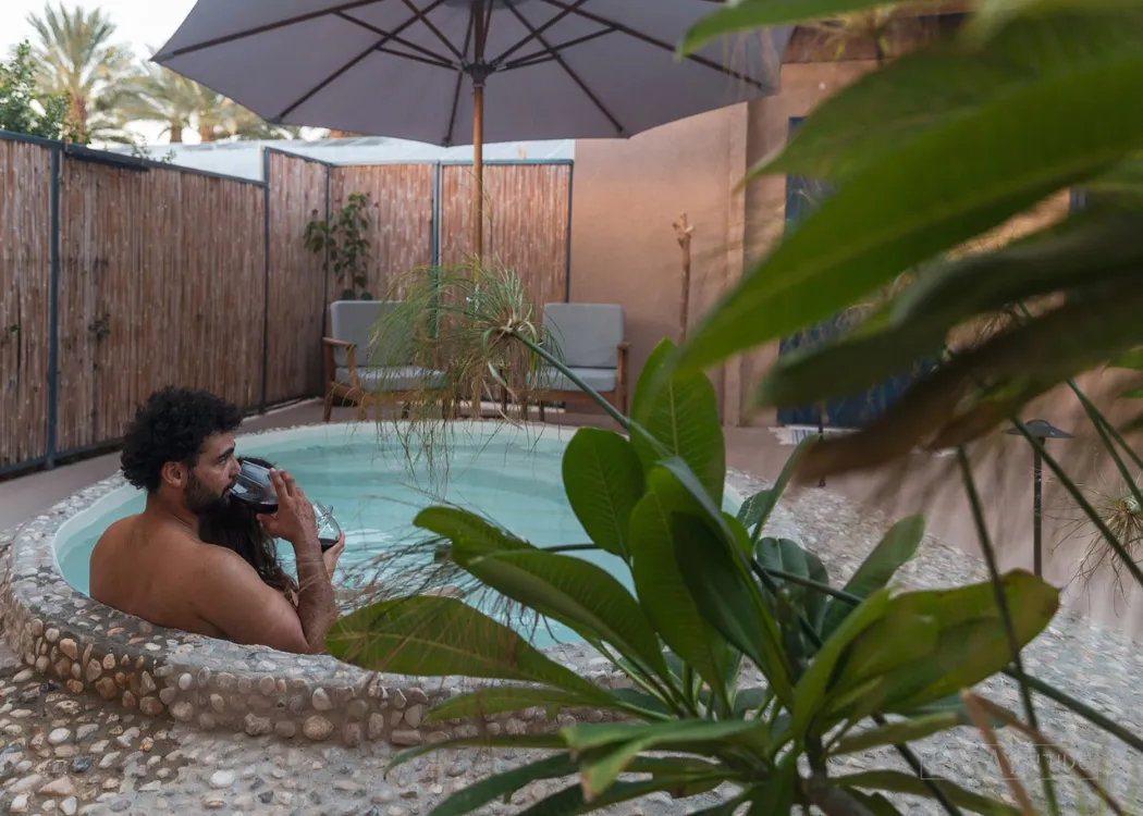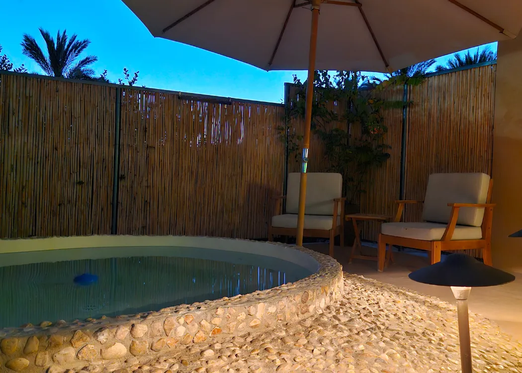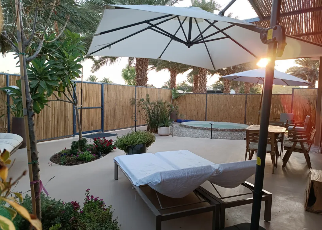 A large, private yard, in an intimate and pleasant atmosphere, with a heated desert-style open air splash pool, and relaxation and lounging areas that include lounge chairs, sun beds, and a double hammock.